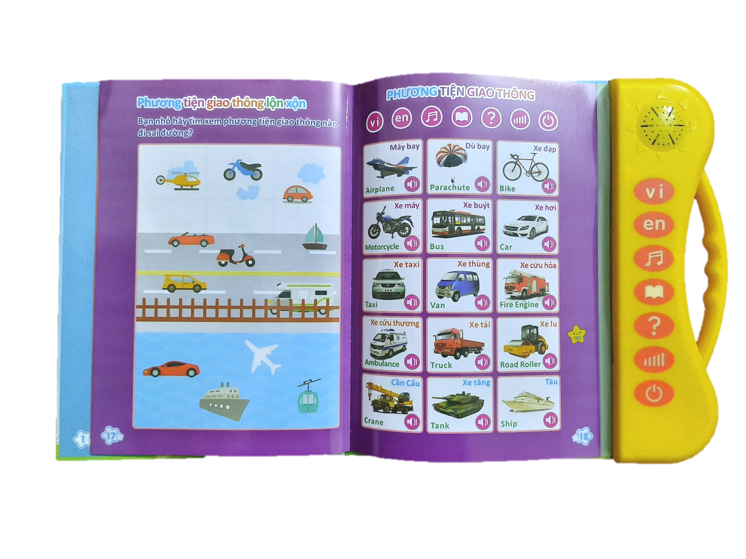 -Mỗi trang của Sách Song Ngữ Anh - Việt Cho Trẻ Em, giúp bé học cách phát âm tiếng việt và tiếng anh. Bé chỉ cần chọn hệ ngôn ngữ và nhấn vào hình ảnh cần học là có thể nghe và phát âm theo sách