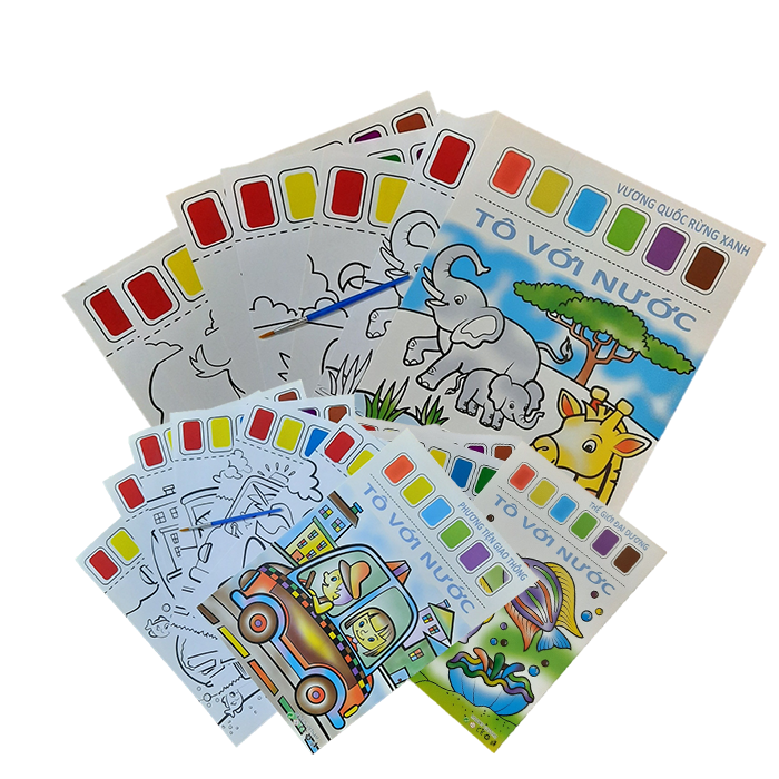 +Với mực mầu được ép khô sẵn trên các bức tranh với bảng màu sẵn có cộng với bút lông mềm mại bé chỉ cần nhúng bút vào nước rồi mài nhẹ trên bảng màu làm tan màu là bé có thể thoải mái tô và sáng tạo mà không sợ vấy bẩn quần áo tay chân hay bàn học.